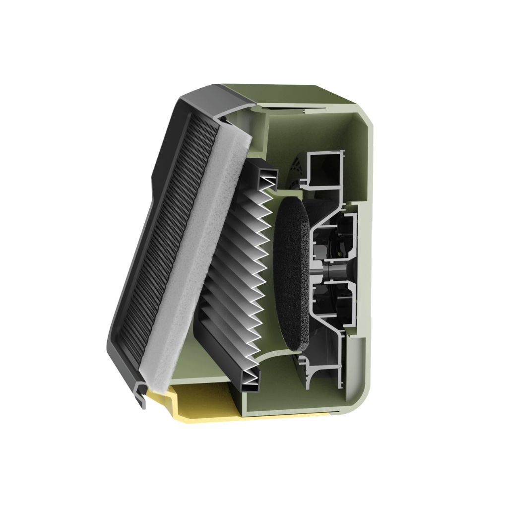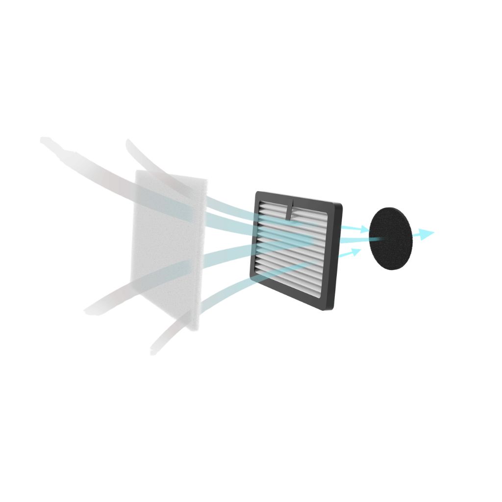 Sistema di filtrazione a tre stadi: prefiltro per la separazione delle particelle grossolane. Filtro principale di alta qualità conforme alla classe HEPA 13 e filtro a carbone attivo. Sostituzione del filtro semplice.
