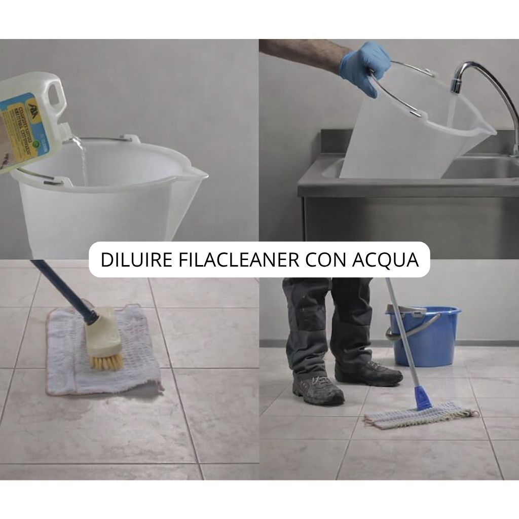 - Diluire CLEANER PRO 1:200 (25 ml in 5 litri d’acqua). Non occorre risciacquo. Per gli sporchi più tenaci eseguire il lavaggio con soluzioni più concentrate