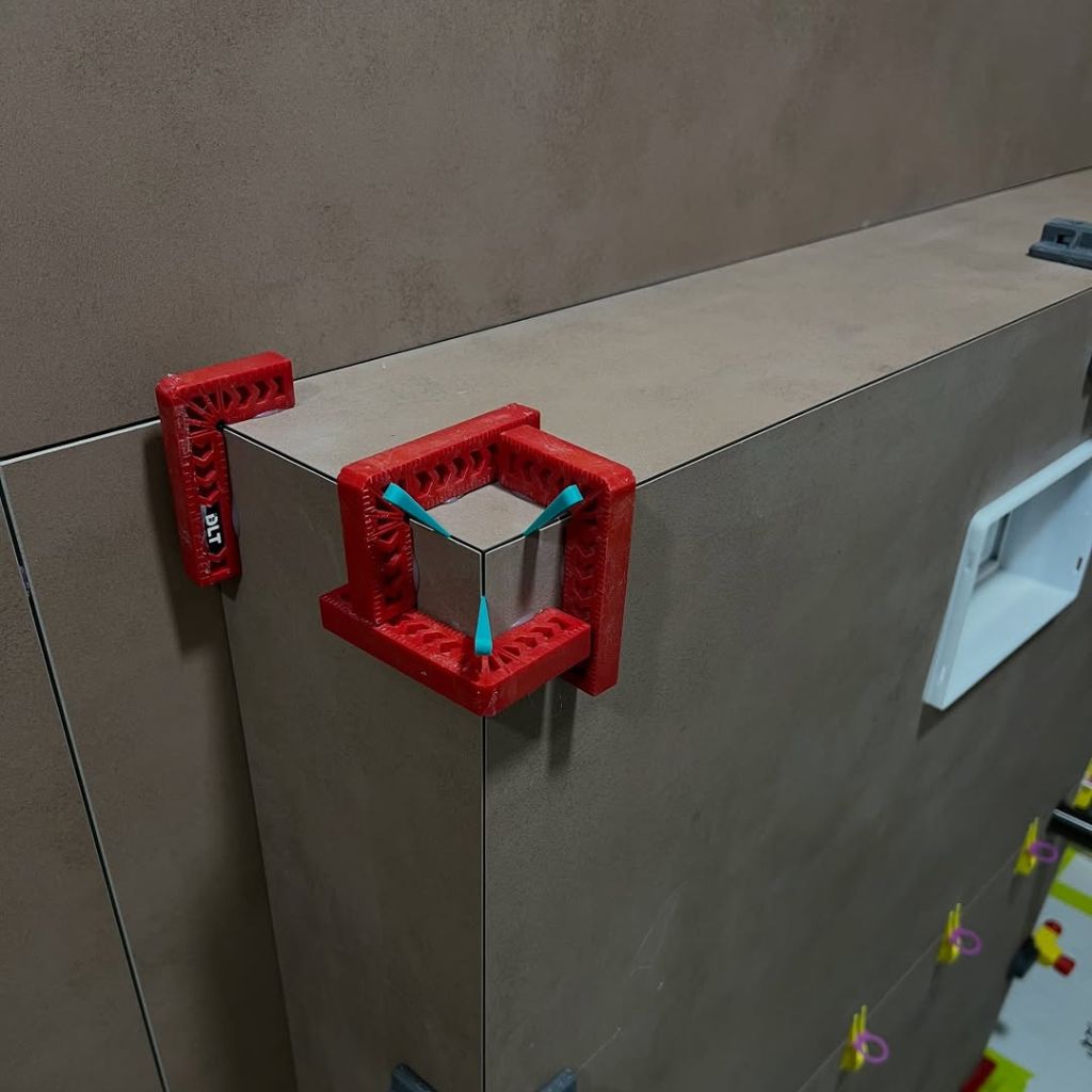 Morsetti angolari a 90° realizzati in plastica, utilizzati per mantenere l’allineamento durante l’incollaggio di piastrelle e lastre in ceramica o gres porcellanato.